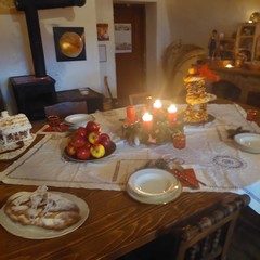 Za chvíli jsem nahoře. Dávám si medovinku. Vánoční atmosféra. Obcházím. Dívám se. Vybírám. Zastavuji se se známými. Přejeme si do příštích časů. Moc ráda točím, fotím kuchyni. Hřeje tu sporák. Voní františky. Svítí svícny. Je tajemná. Krásně prostřený stůl. Kouzelné.