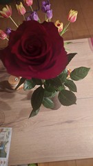 Volám. Ne. Nestavila. Tak to mám radost. Někdo mi sem položil růži. Abych byla veselá. Klidná. Radostná. Abych nedbala vůbec dění ve světě. A to pěkně děkuji. Je nádherná. Překrásná. Dlouho bude ve váze.