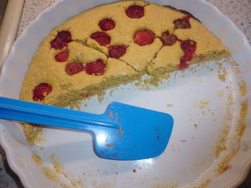 Přichází sousedka. Rychle šlehám čtyři vajíčka, ovesnou mouku, maličko cukru. Jahody. Koláč hotov. Výborný. Mám co nabídnout ke kafi. Druhá várka slejvanu. Intenzivní, delší. Pod keři stále sucho. Ještě že jsem dopoledne prolila túje, keře, stromy. Dík za deštíček. Málo, ale dík.